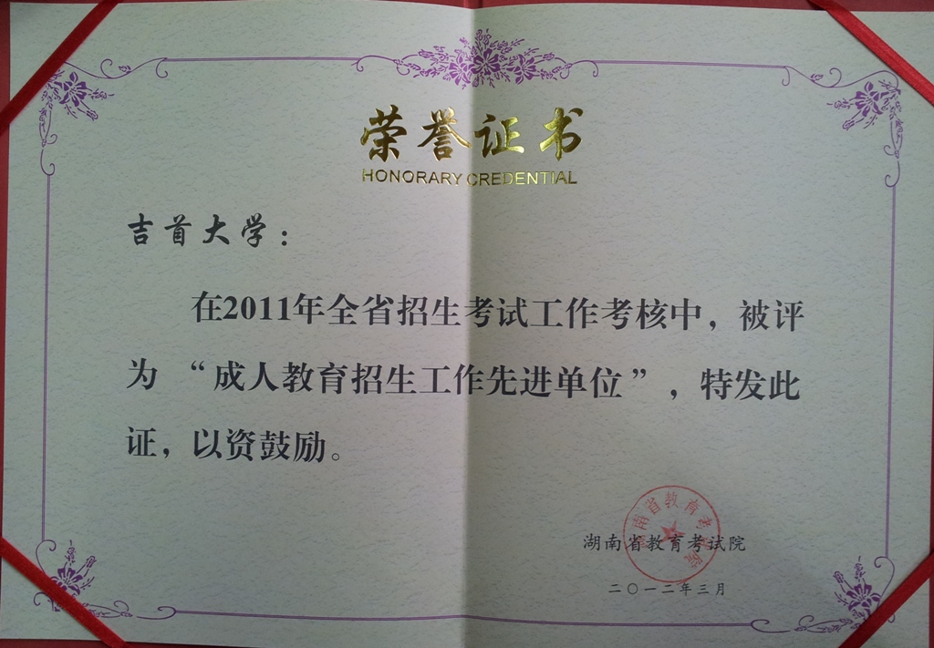 日前,从湖南省教育考试工作会议上传来喜讯,公司在2011年全省招生考试工作考核中,被省教育考试院评为“成人教育招生工作先进单位”。