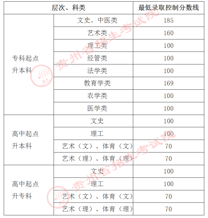 根据教育部下达我省2021年成人高校招生计划,结合全省考试总体情况,省招生委员会划定贵州省2021年成人高校招生各层次、科类最低录取控制分数线,现公布如下: